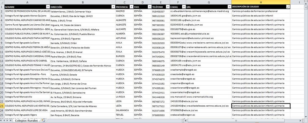 Completa Base de datos de 870 Colegios Rurales de España en formato excel, organizada con todos los datos de contacto (incluyendo nombre, dirección, localidad, teléfono, emails y sitio web).