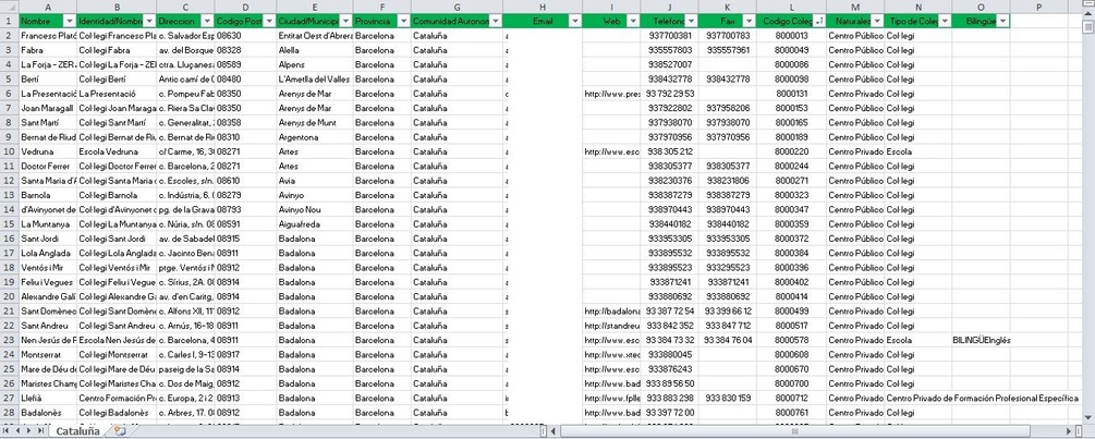 Completa Base de datos de 5438 Colegios de la Comunidad de Cataluña (España) en formato excel, organizada con todos los datos de contacto.