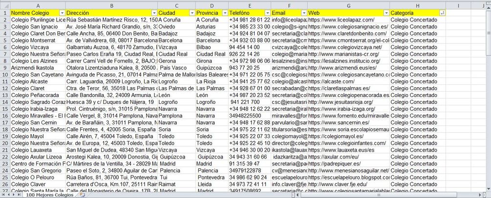 Completa Base de datos de los 100 Mejores Colegios de España en formato excel, organizada con todos los datos de contacto (incluyendo nombre, dirección, localidad, teléfono, emails y sitio web).