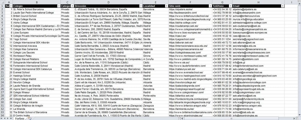 Completa Base de datos de los 100 Mejores Colegios de España 2022 en formato excel, organizada con todos los datos de contacto (incluyendo nombre, dirección, localidad, teléfono, emails y sitio web).